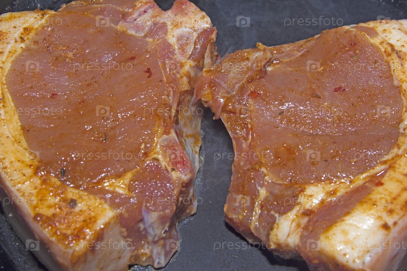 Маринованный в острых специях, кусок свинины на черном фоне, процесс приготовления мясных блюд в духовке