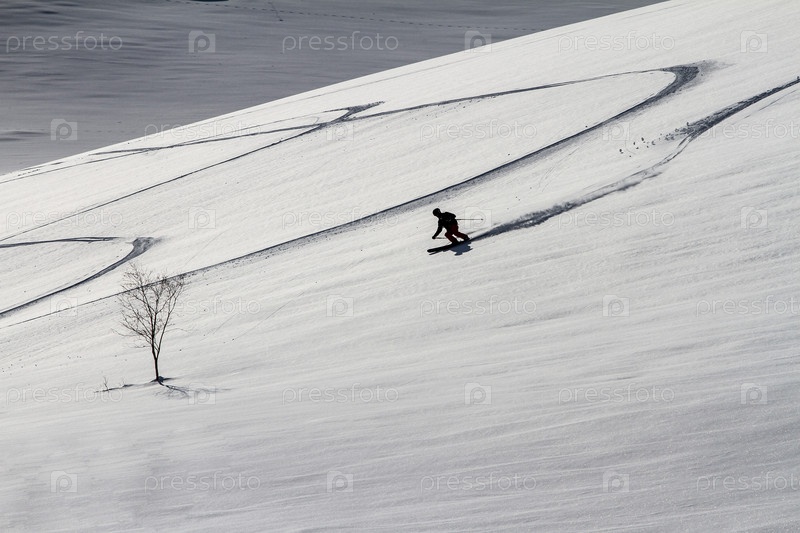 Следы лыж на свежем снегу и маленькая фигурка фрирайдера. Камчатка