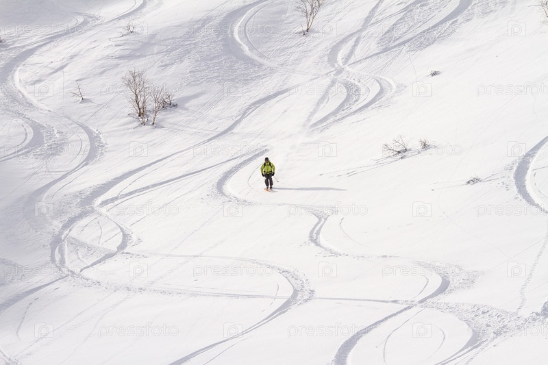 Следы лыж на свежем снегу, фрирайдер на склоне. Камчатка
