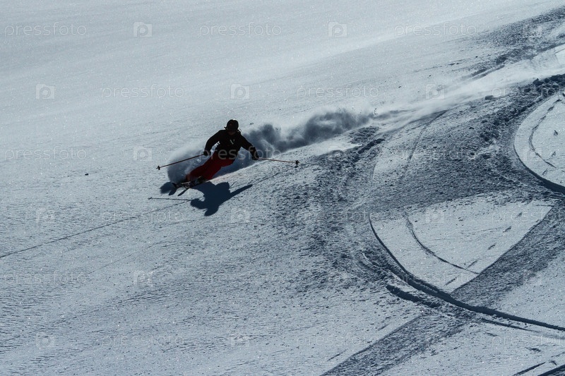 Следы лыж на свежем снегу и силуэт фрирайдера. Камчатка