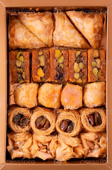 Коллекция восточных сладостей в золотой коробочке. Арабская пахлава и десерт уш-эль-буль-буль. Вид сверху. Полный кадр
