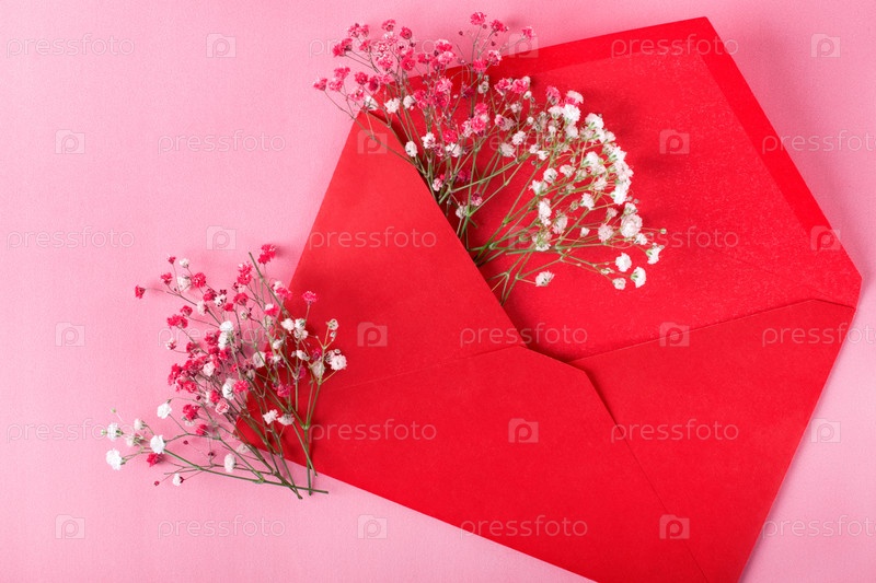 Красный конверт с разноцветными цветами гипсофилы на розовом. Весенняя плоская композиция. Любовное письмо или свадебное приглашение