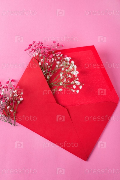 Красный конверт с разноцветными цветами гипсофилы на розовом. Весенняя плоская композиция. Любовное письмо или свадебное приглашение