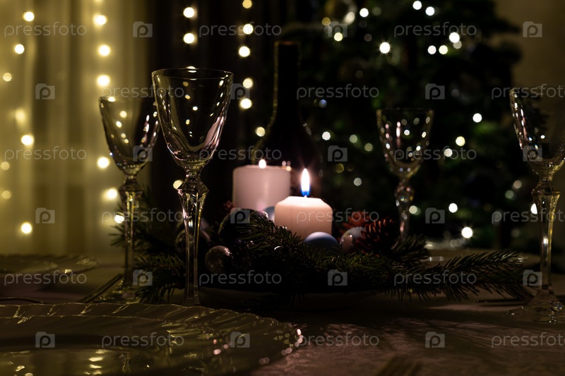 Сервировка праздничного стола. Еда и напитки, тарелки и стаканы. Вечерние огни и свечи. Рождественский ужин в канун Рождества и Нового года