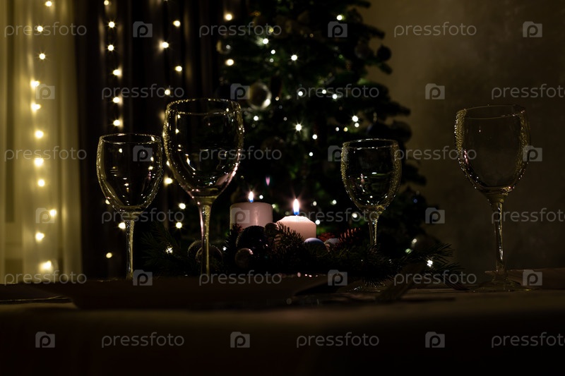 Сервировка праздничного стола. Еда и напитки, тарелки и стаканы. Вечерние огни и свечи. Рождественский ужин в канун Рождества и Нового года
