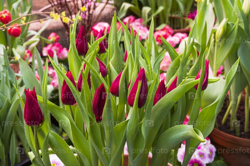 Яркие бордовые тюльпаны. Традичионная ежегодная выставка "Репетиция весны" в в Аптекарском Огороде (филиал ботанического сада МГУ). Москва