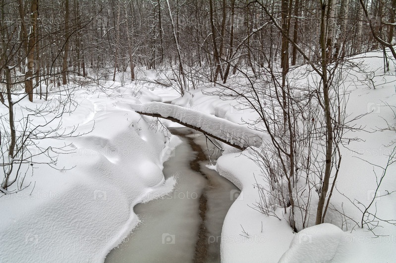 Незамерзающий ручей в зимнем лесу. Конец февраля. Битцевский лес, Москва. Верховья реки Чертановка