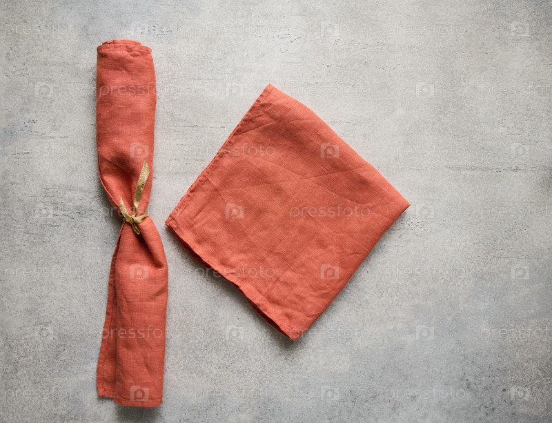 Терракотовые сложенные льняные салфетки на сером бетонном столе с копией пространства, вид сверху