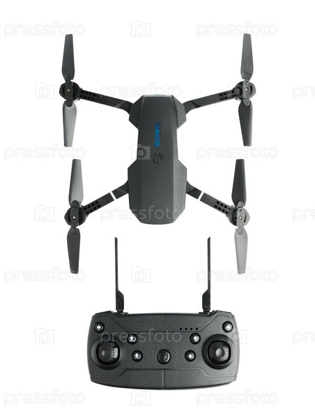 Небольшой современный четырехмоторный беспилотник с радиоуправляемым пультом дистанционного управления, изолированным на белом фоне, вид сверху