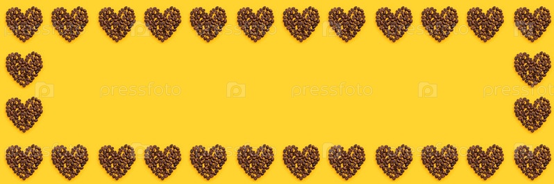 Рамка из кофейных зерен в форме сердца на ярко-желтом фоне баннера с копировальным пространством