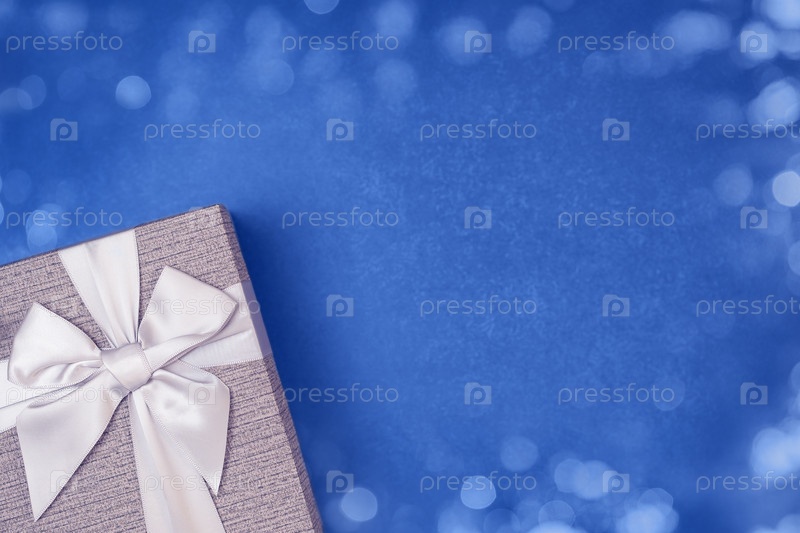Бежевая подарочная коробка с лентой на синем фоне. Подарки и тема праздника. Шаблон для рождественской открытки