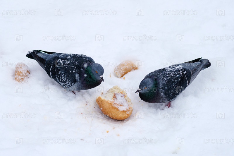 Два голубя в снегу и куски хлеба. Выборочный фокус