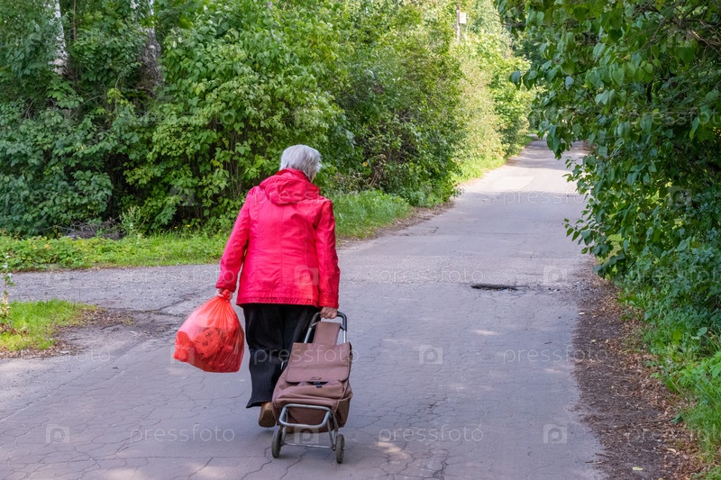 Пожилая женщина идет по дороге. Пожилая женщина несет тележку и мешок с мусором