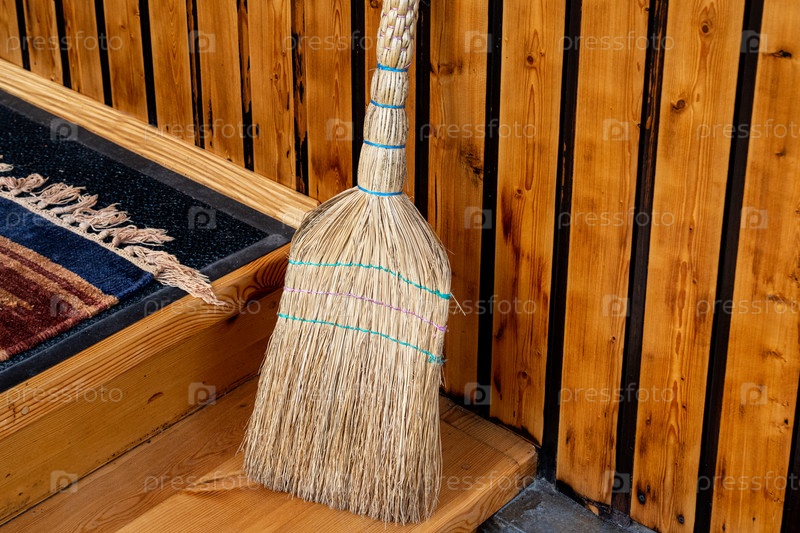 Метла против деревянной стены. Закрыть. Выборочный фокус