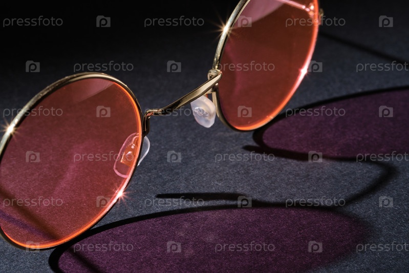 Крупный план очков с розовыми линзами на темном фоне. Блики. Выборочный фокус. Минималистичный дизайн с копией пространства