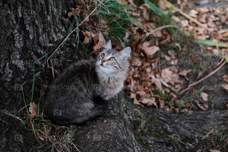 Маленький красивый котенок сидит под деревом и смотрит вверх. Осень