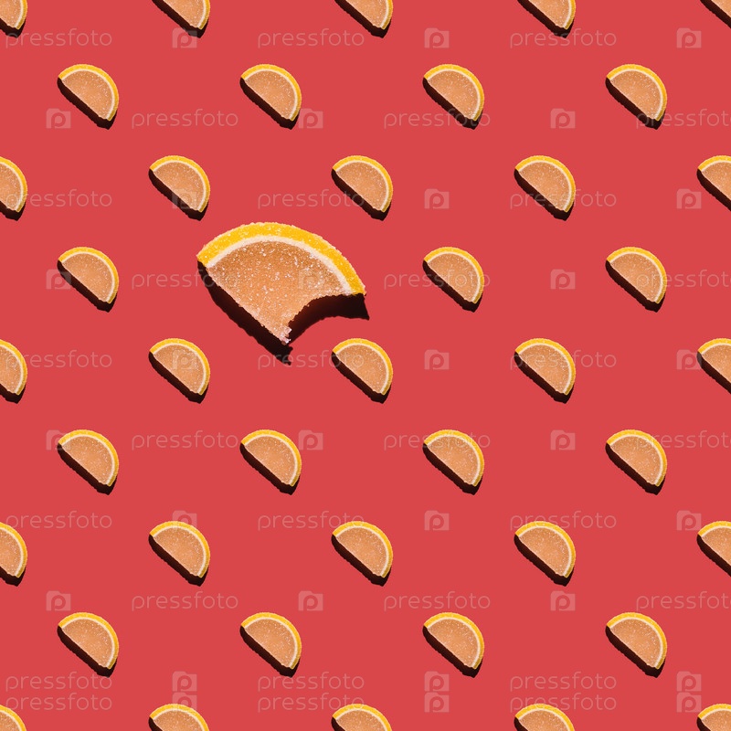 Бесшовный узор из фото кусочков мармелада на розовом фоне. обои со сладостями. Хорошо использовать для обоев, текстиля, фона, плаката, обложки, открытки