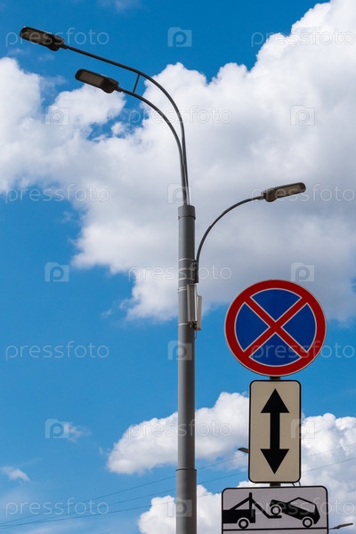 Дорожные знаки на фоне голубого неба, пушистых облаков и уличного фонаря. Остановка знаков запрещена и эвакуация автомобиля