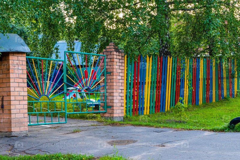 Кривые ворота на детскую площадку. Разноцветный забор и ворота в сельском детском саду