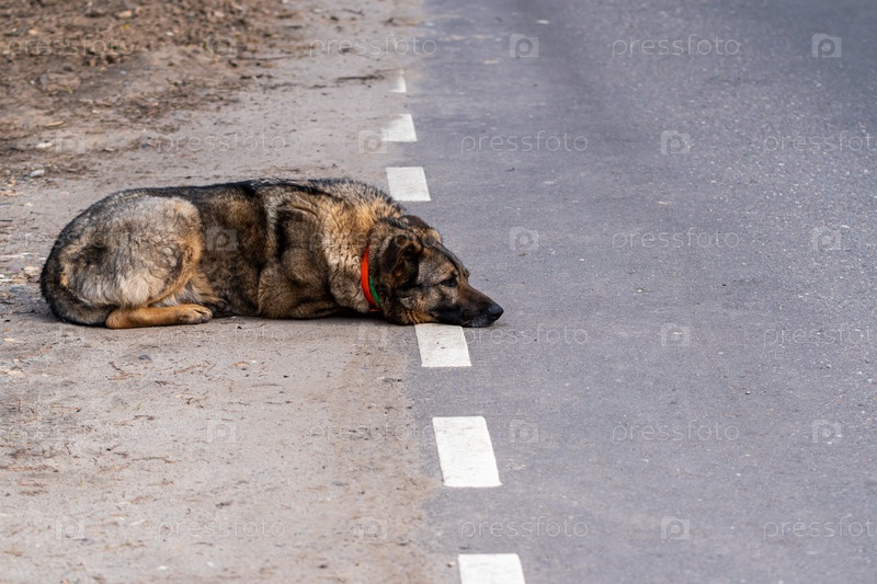 Потерянная собака лежит на обочине асфальтовой дороги