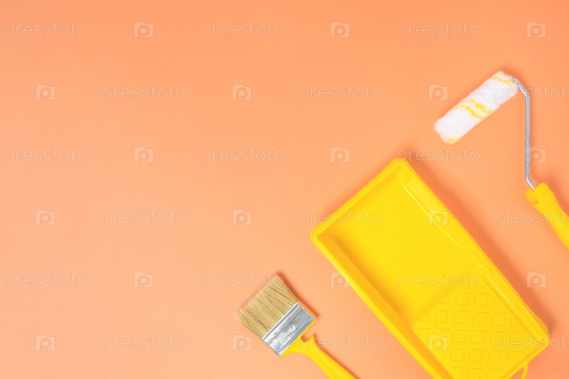 Набор для покраски стен или мебели, валик, кисть, ванночка для краски. Ремонт и обновление космического фона с копировальным пространством