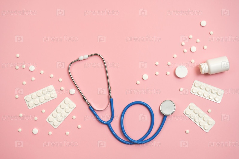 Белые таблетки и стетоскоп на розовом фоне. Медицинский фон для дизайна