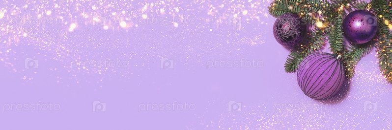 Рождественский фиолетовый баннер с еловой веткой и декоративными шарами. Новогодний фон со светящимися огнями