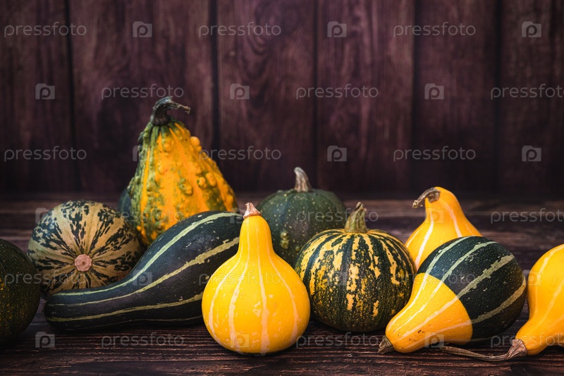 Тыквы разных форм и размеров на деревянном столе, пространство для копирования
