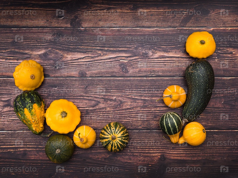 Тыквы разных форм и размеров на деревянном столе, пространство для копирования сверху