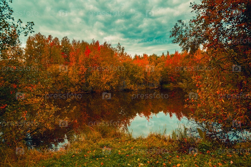 Красочный осенний пейзаж возле лесного озера, заросшего деревьями и кустарниками