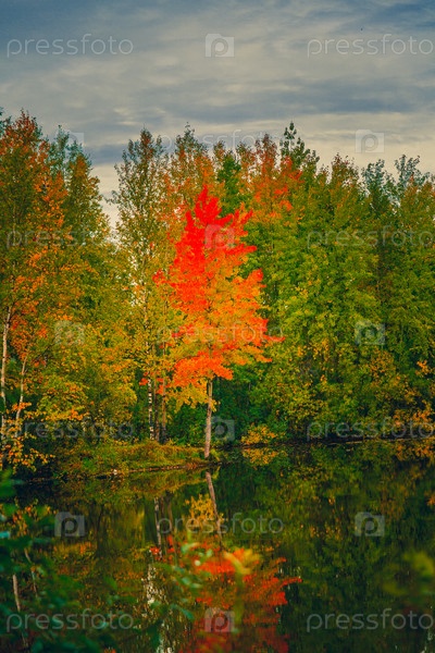Красочный осенний пейзаж возле лесного озера, заросшего деревьями и кустарниками