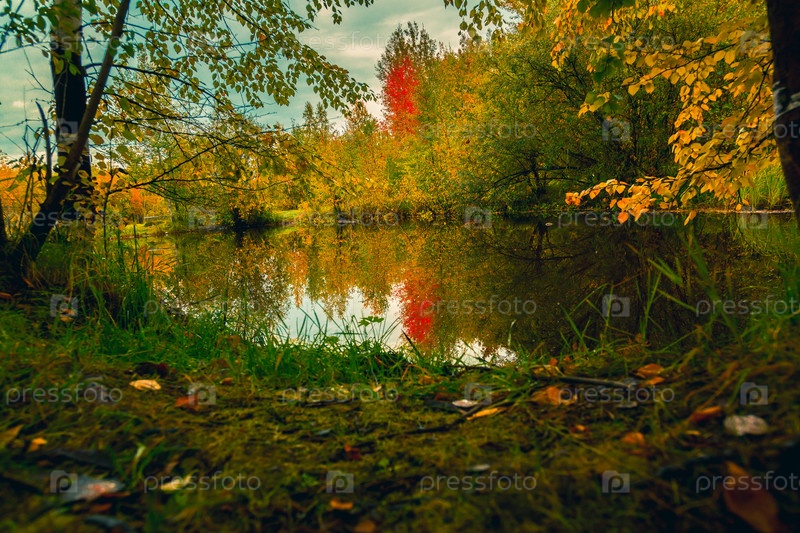 Красочный осенний пейзаж возле лесного озера, заросшего деревьями и кустарниками