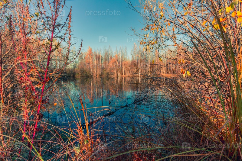 Берега озера заросли травой и кустарником и покрылись инеем после первых заморозков