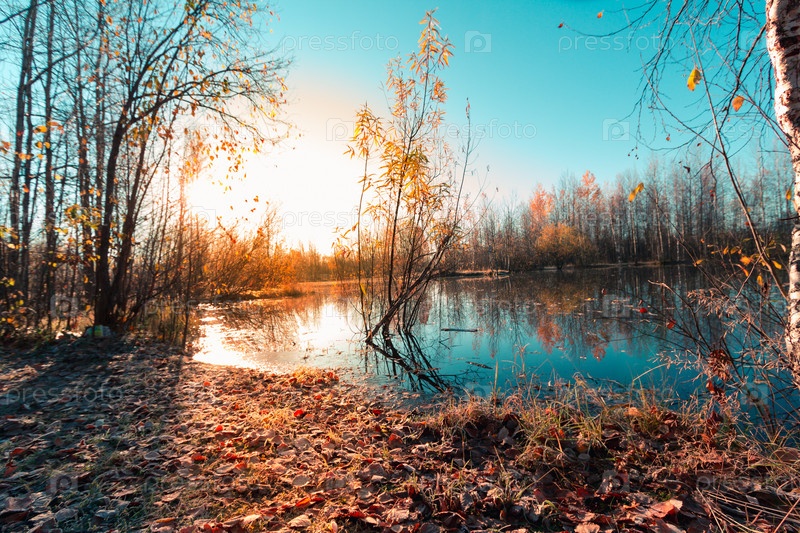 Берега озера заросли травой и кустарником и покрылись инеем после первых заморозков