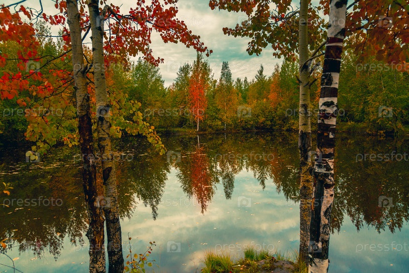 Лесная река с берегами заросшего небольшого леса лиственных пород в сентябре