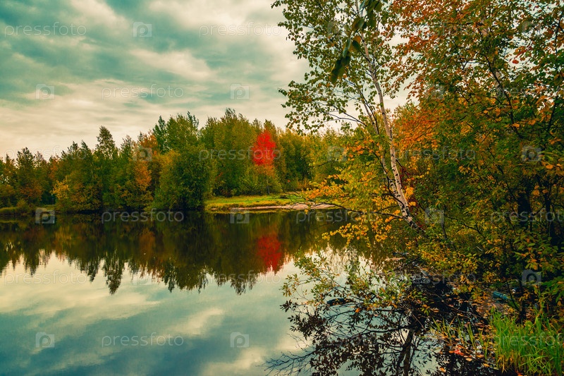 Лесная река с берегами заросшего небольшого леса лиственных пород в сентябре