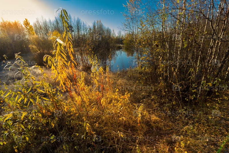 Небольшое озеро, заросшее кустарниками и травой перед заморозками