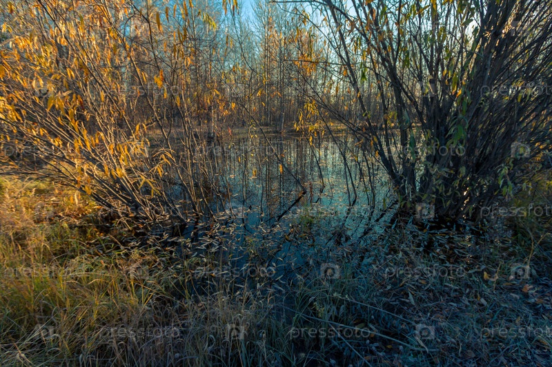 Небольшое озеро, заросшее кустарниками и травой перед заморозками