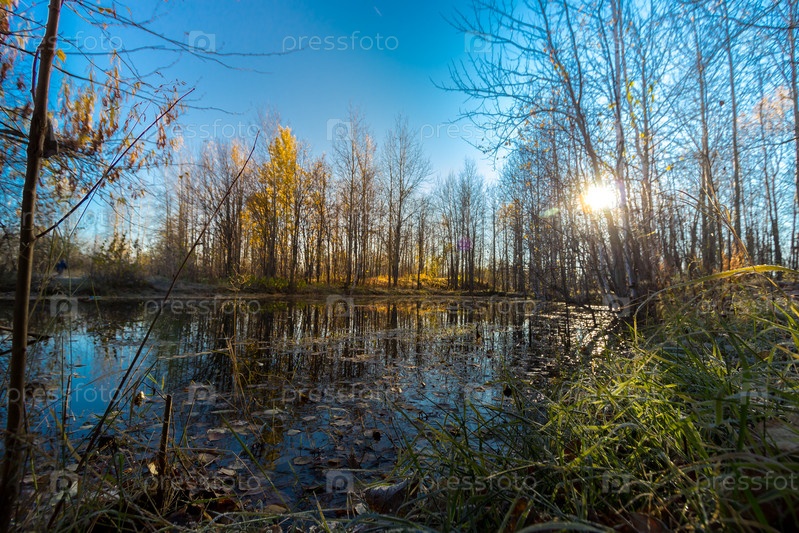 Небольшое озеро, заросшее кустарниками и травой перед заморозками