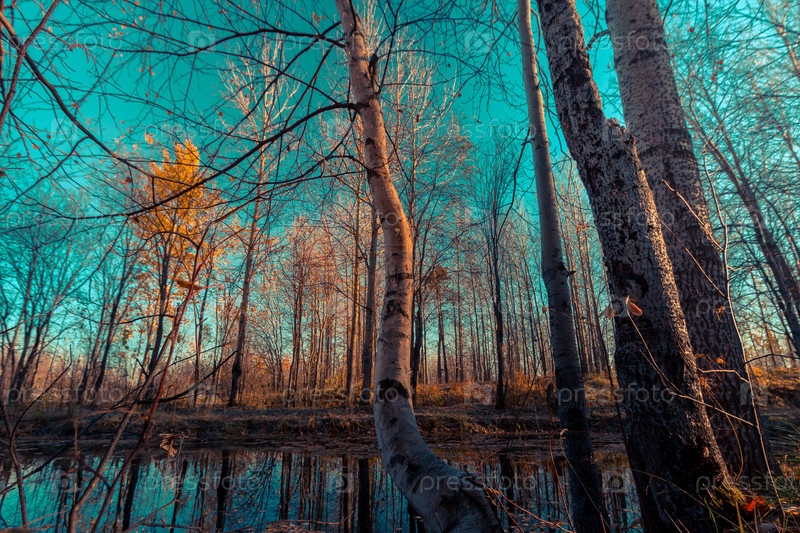 Небольшое озеро, заросшее кустарниками и травой перед заморозками