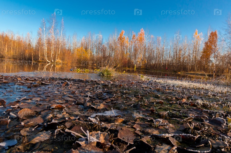 Небольшое озеро, заросшее кустарниками и травой перед заморозками