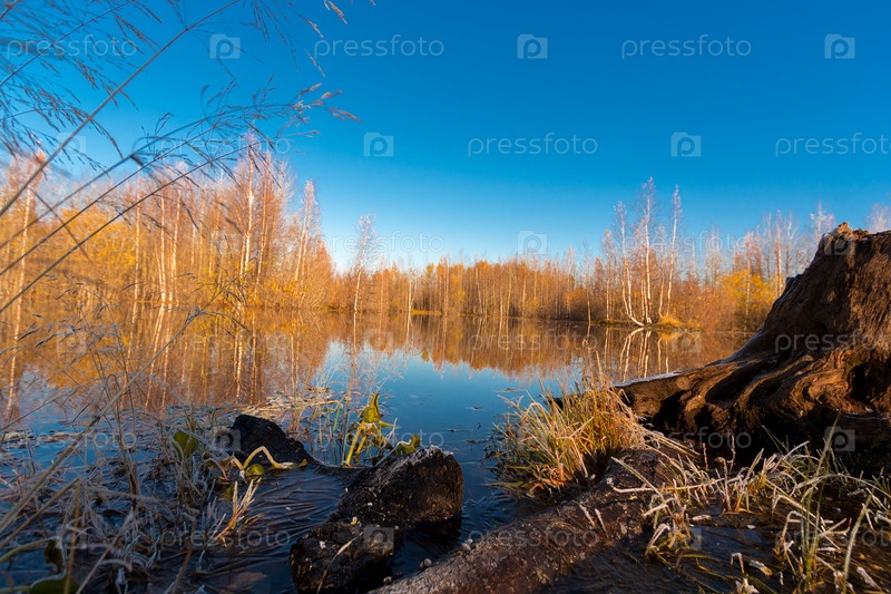 Небольшое озеро, заросшее кустарниками и травой перед заморозками