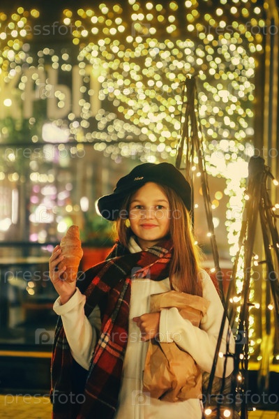 Девочка стоит возле красного автомобиля с бумажным пакетом круассанов