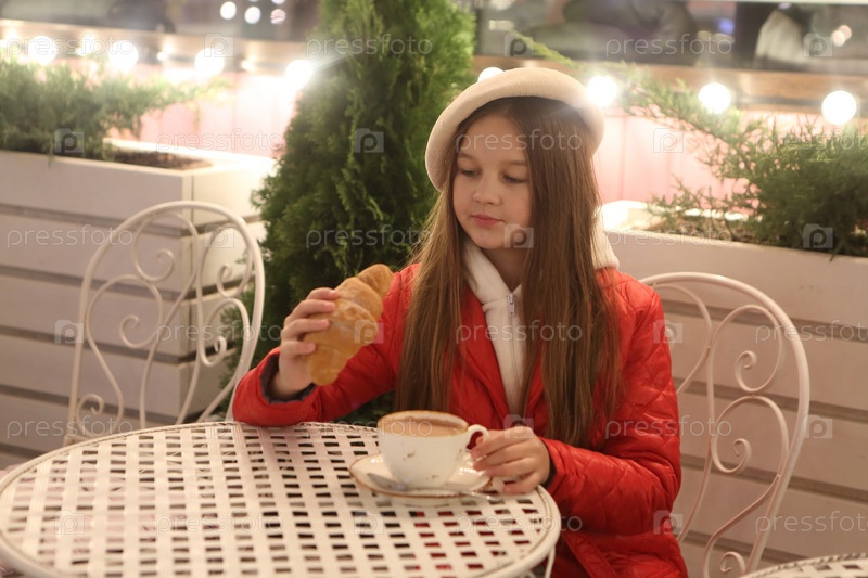 Девочка в кафе ест круассаном с горячим шоколадом