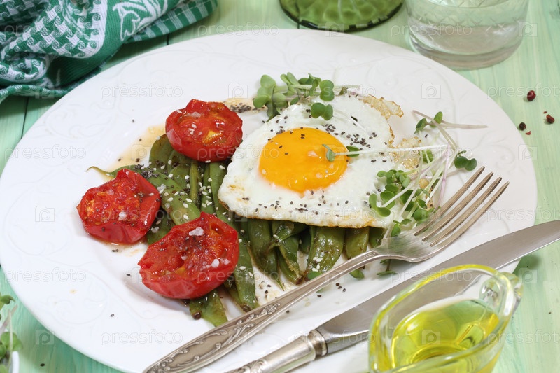 Яичница с зеленой фасолью, помидорами на зеленом деревянном фоне
