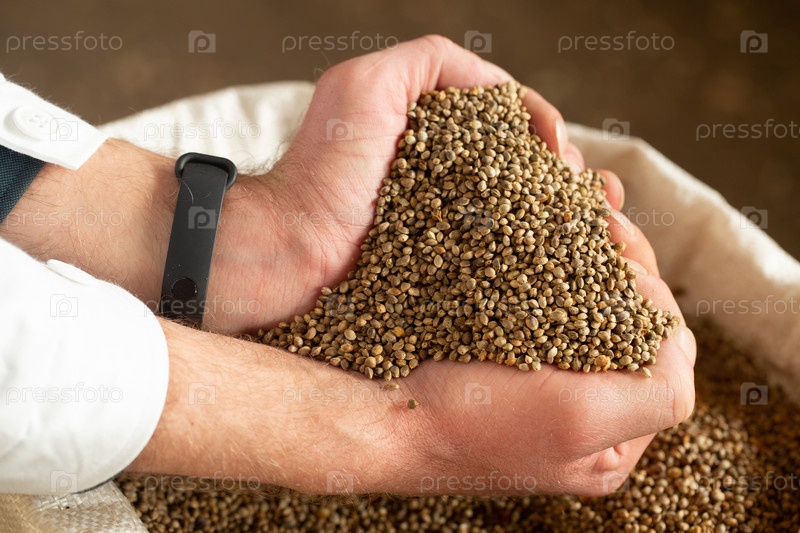 Мужские руки держат зерна конопли