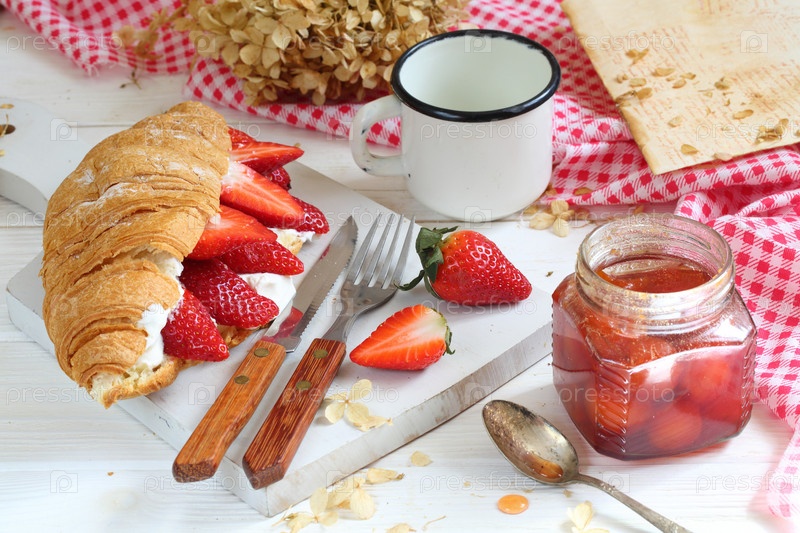 Круассан с клубникой и сыром рикотта на белом фоне