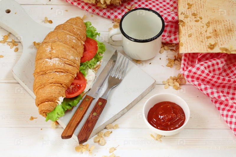 Круассан с помидорами, сыром и ветчиной не на белом фоне