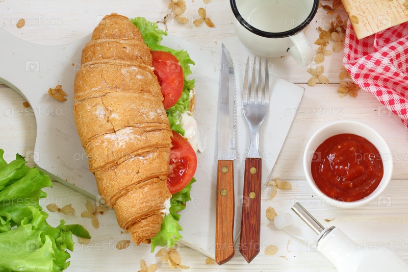 Круассан с помидорами, сыром и ветчиной не на белом фоне