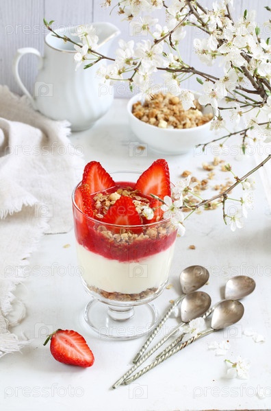 Десерт с мягким сыром и клубникой на белом фоне